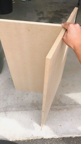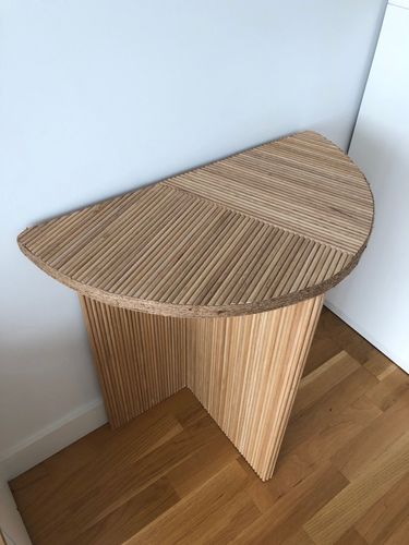 For the base of the table, I used an MDF board, cut it into 2 straight pieces for the bottom and 1 half curved piece for the top. I used the oak dowel to cover the whole table and a jute rope to cover around the half-circle trim. Finished off with a Satin Waterbased Clear Wood Varnish.