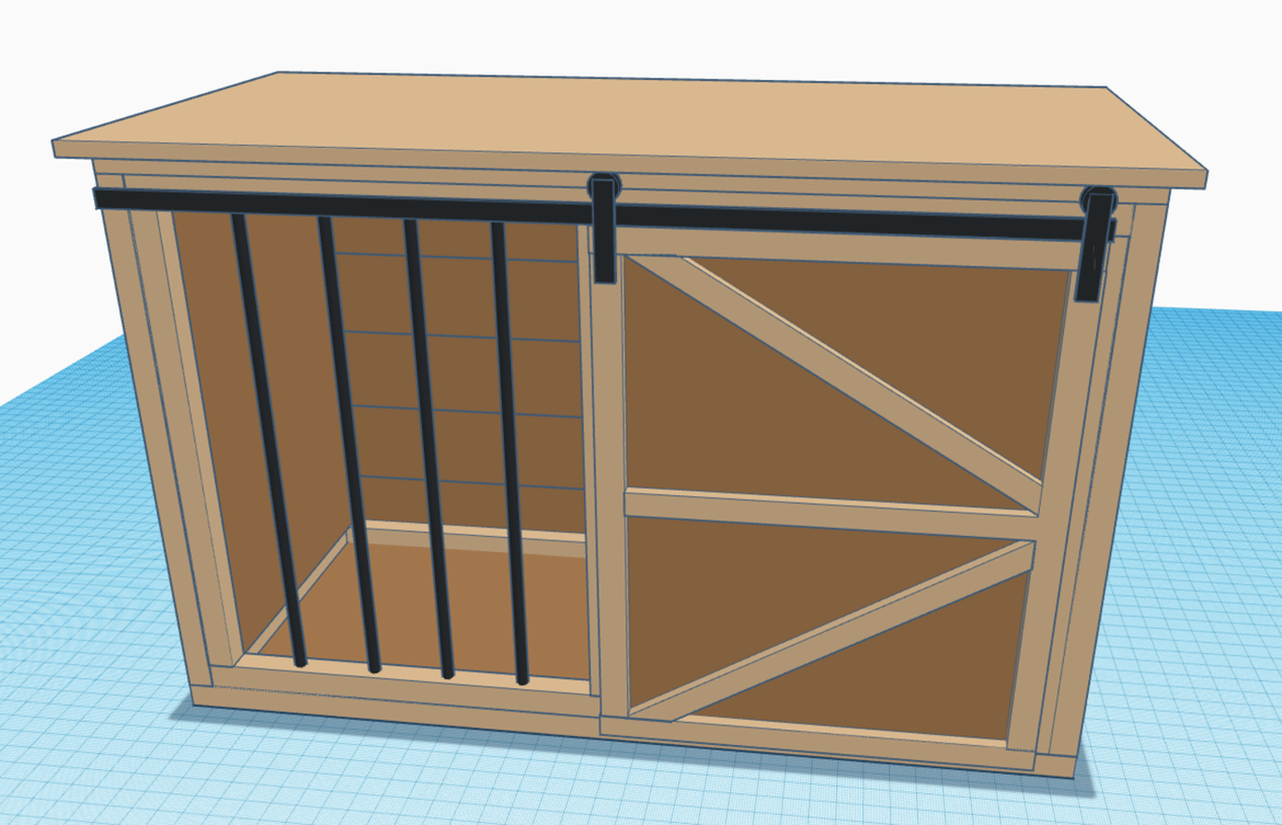 This is a dog crate buffet cabinet with a sliding mini barn door. This is used as a safe place with all pets, which they can use to sleep in.