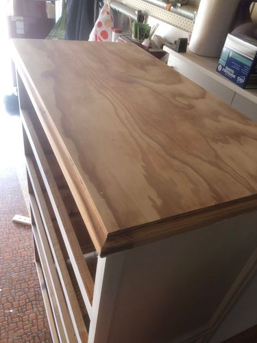 Top was fully sanded back, I was just going to finish in clear coat, but decided to water down some paint and coated the top with a sponge, then 3 coats of waterbased satin varnish to give a washed effect allowing the grain to show through