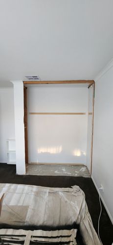 We wanted to install a flatpack wardrobe as we've done it on our walk in robe as well. The first step was to consider if we were removing the whole frame. We decided to leave a bit behind to make it a picture wall, which is what you see when you enter into the room.