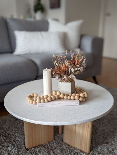 I saw a table from Globewest that I loved, but for $1500 it was out of my budget and I just knew I could DIY it for less. So I purchased the Finn Coffee Table from Kmart ($29) and the Home Bazaar Terrazzo Coffee Table from Bunnings ($60) and combined them using my favourite Selleys Hold Up Glue.