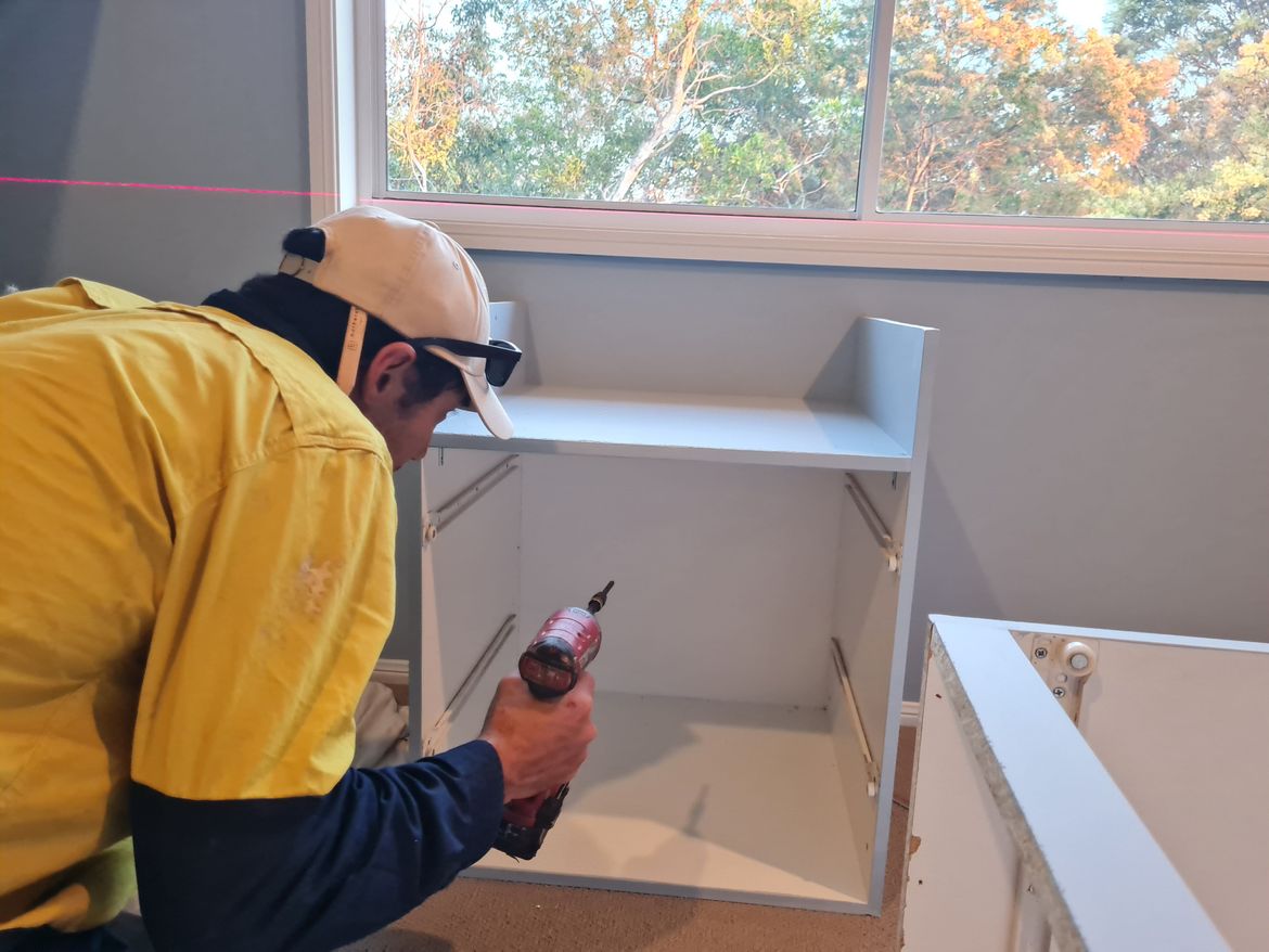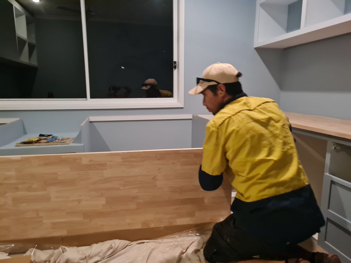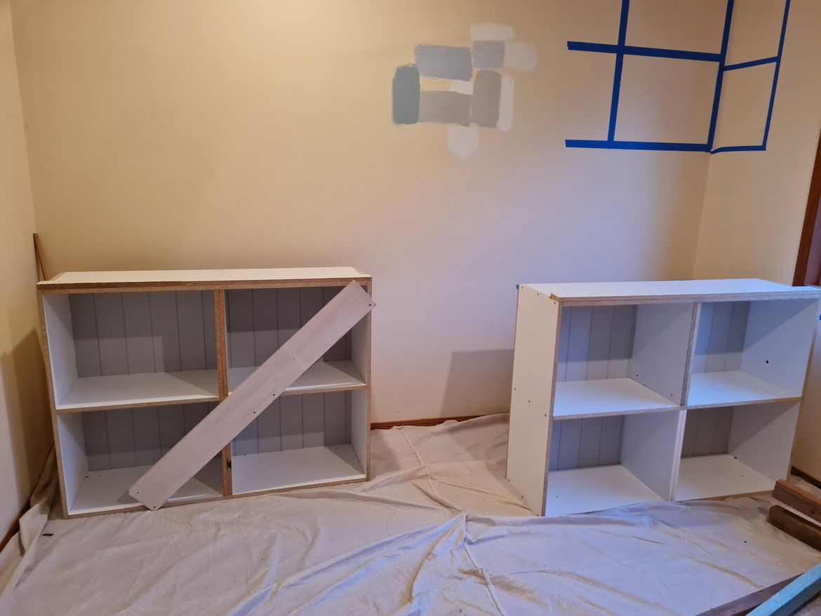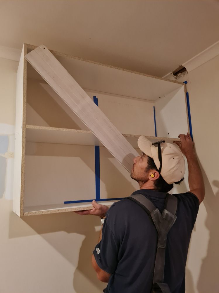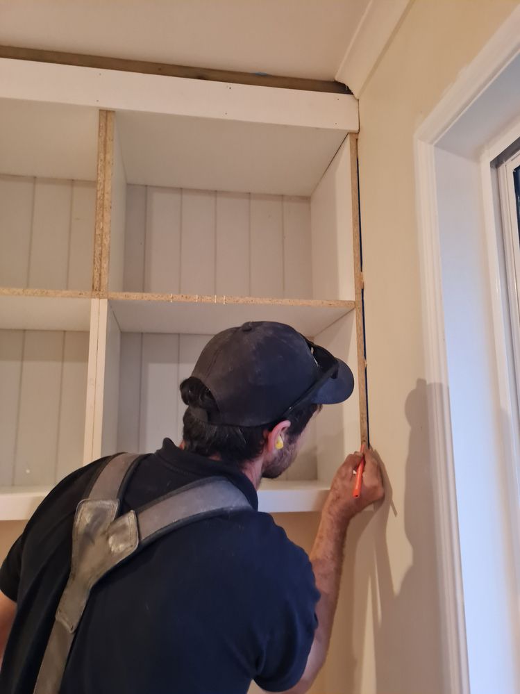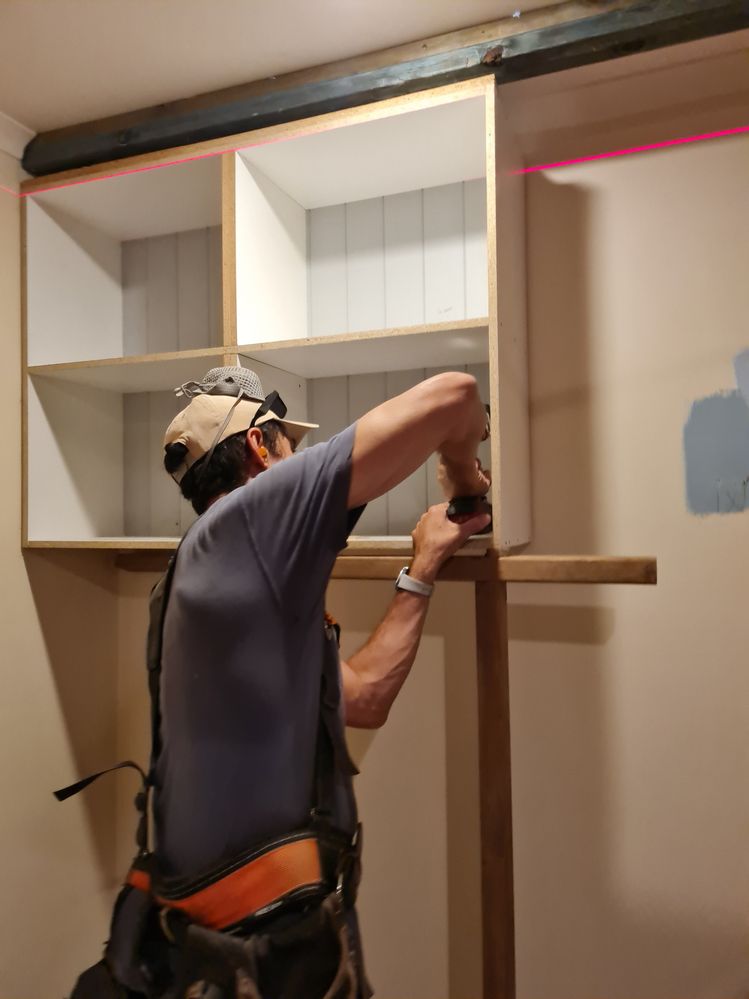 We transformed an office/guest bedroom using custom cabinetry from an old kitchen and materials from Bunnings. The bottom cabinets were painted with Dulux paint, while the old cabinet shells were cut, nailed, and repurposed into top shelving. We also repurposed old VJ roofing and added it to the back of the cabinets for texture. We added new timber benchtops, brass knobs and installed strip lighting under the shelves for a modern touch. The window was also repainted to complete the look. This creative and budget-friendly project showcases the versatility of Bunnings materials and a bit of DIY ingenuity.