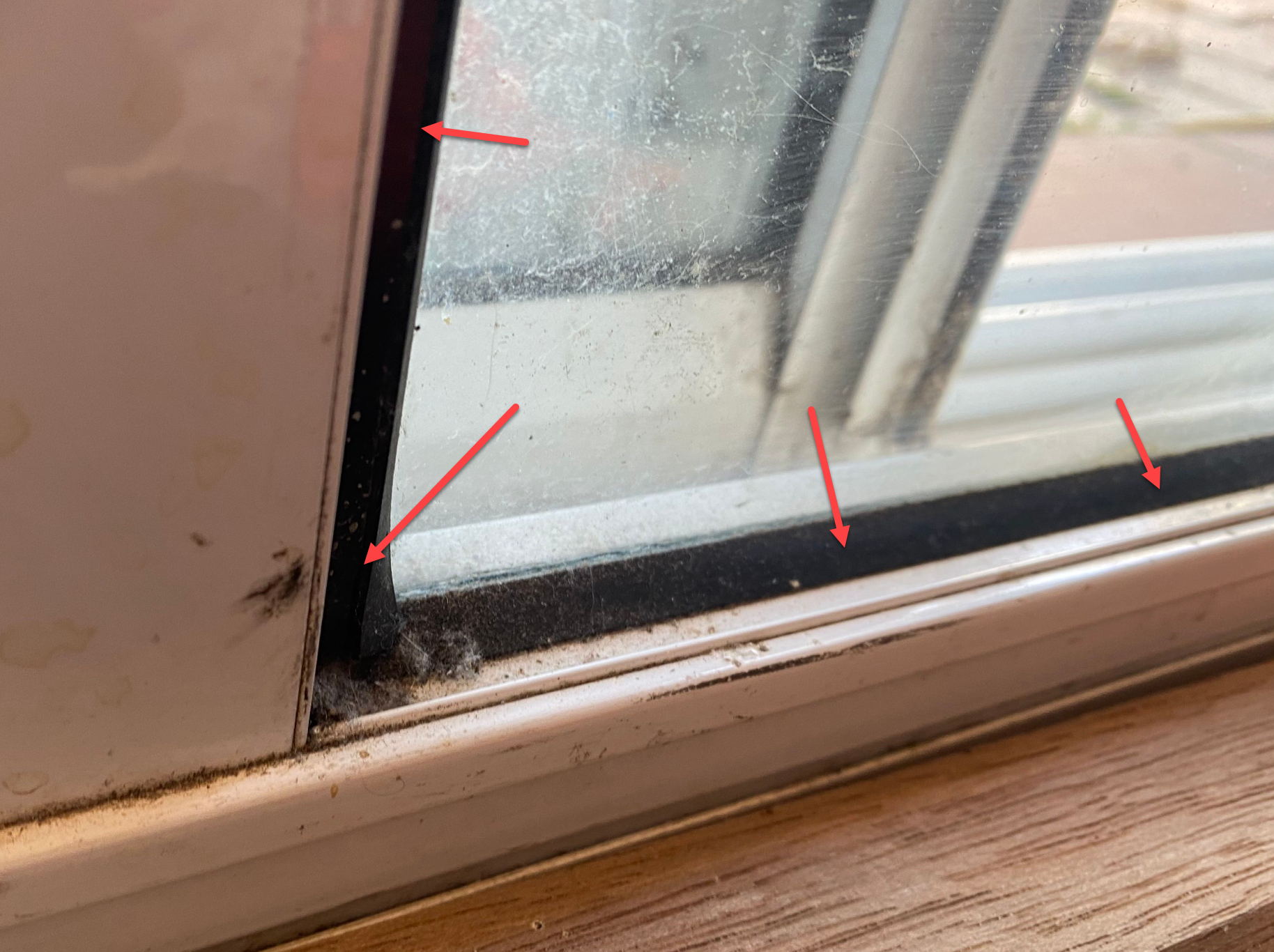 In aluminium framed windows, the glass is held in place by that black rubber that runs around the perimeter of the glass. This is known as glazing wedge, and it is a specialist product that is relative to the thickness of the pocket in the aluminium and the thickness of the glass.