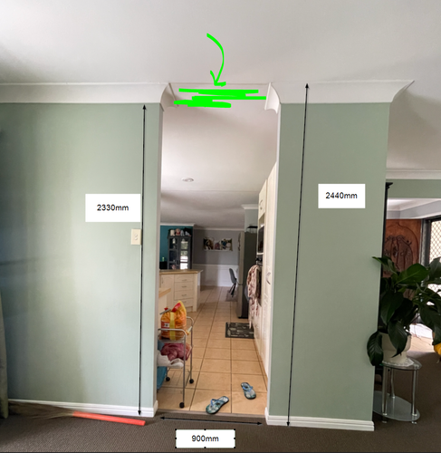 All our barn doors are available for you to select from on the Bunnings website. You simply need to choose one that you like the style of and that the size is slightly larger than your opening. For example, the Hume 2150 x 1000 x 35mm Internal Barn Door Frontier FBDS1 would be suitable for your second smaller opening. You will need to construct a bulkhead to fill the space above the door.