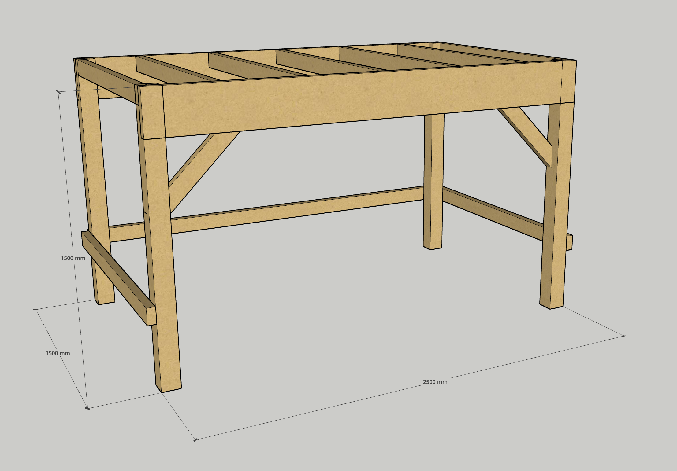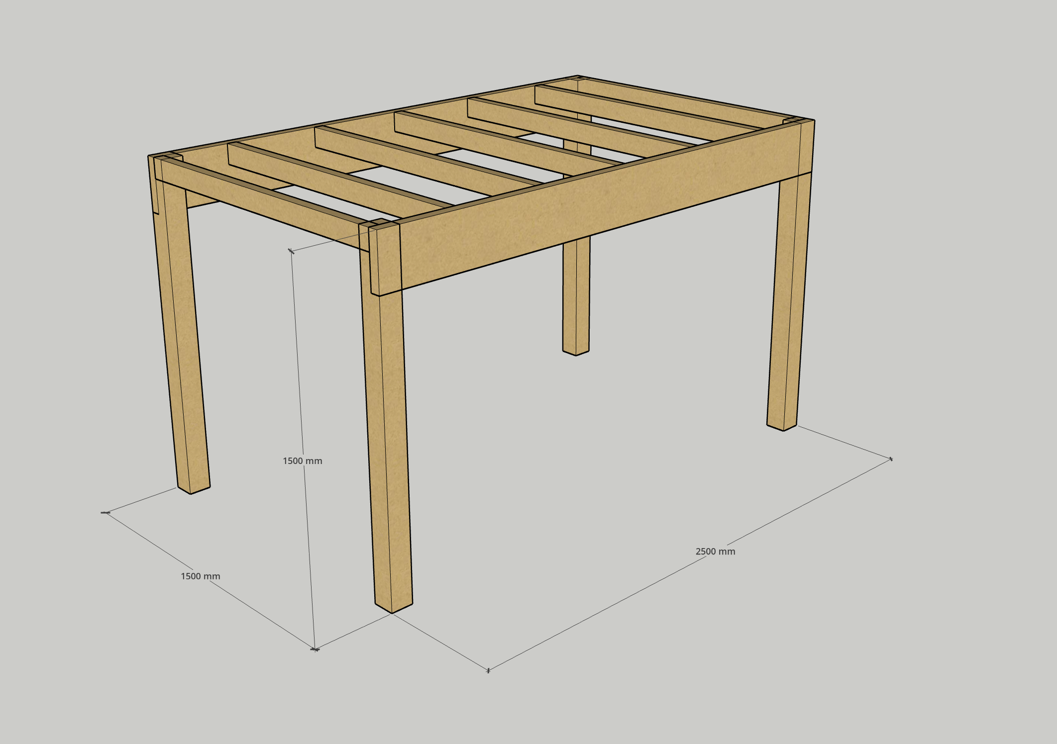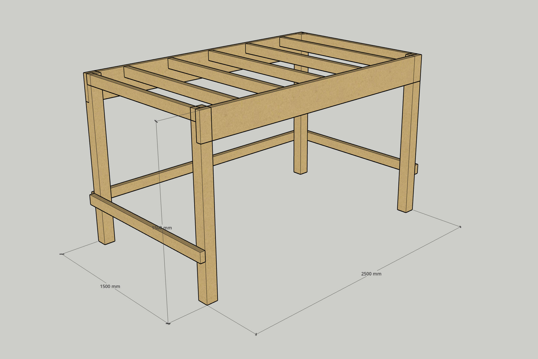 Any timbers that span between these bearers would be treated like the joists on a deck, so we can use Joist Span Tables to select a timber capable of spanning that distance. In this instance, 90x45 timbers spaced at 450mm intervals along the length of the bed will suffice.