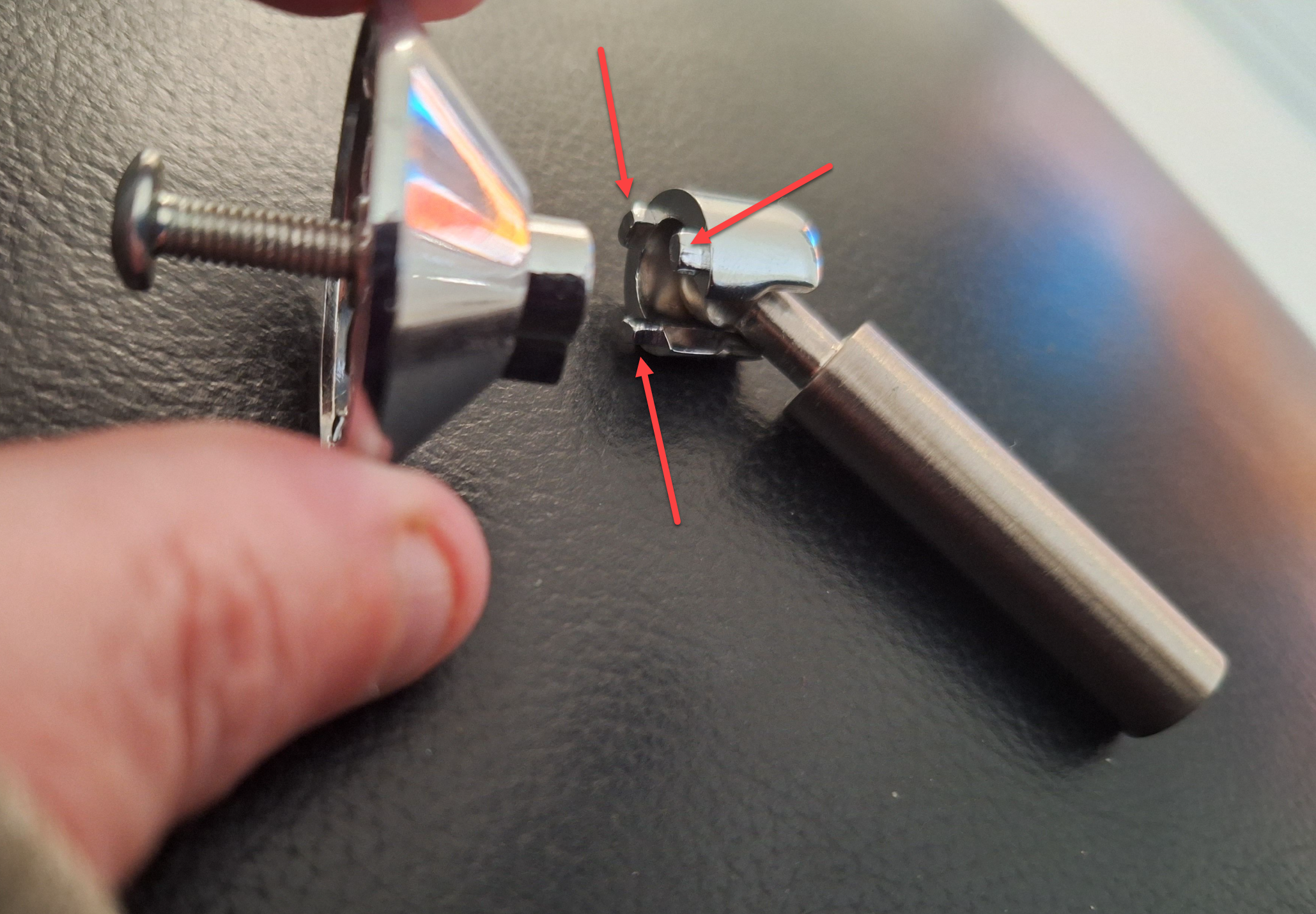 I wonder if when the screw is done up with the handle attached, some interior mechanisim then locks those pins in. Could you try winding the screw up without it being attached to a door to see if it does anything on the inside of the underside?