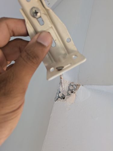The problem you've had here is that the screw is not long enough to properly embed itself in the stud. The location is actually perfect because there is always a stud behind a corner, but the screw that was used is not long enough to bite into it.