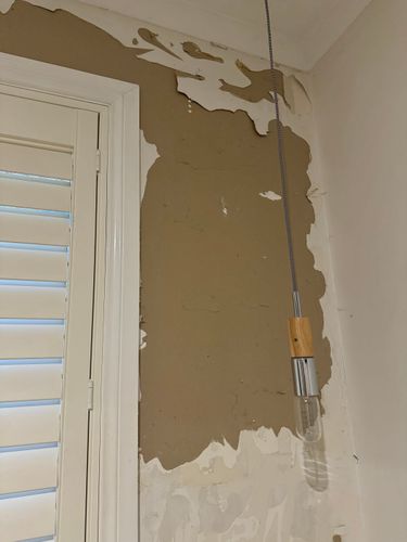 Once the loose, flaking paint has been removed, you'll need to apply a skim coat of plaster to the areas where the paper has been pulled off.