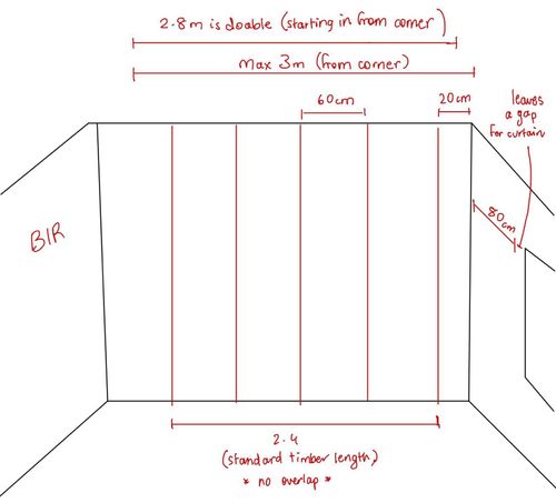 (LHS wall is the front face of a BIR, which has drawers that extend out beyond the doors, so the left end point of the shelves will have to be fixed in roughly that spot).