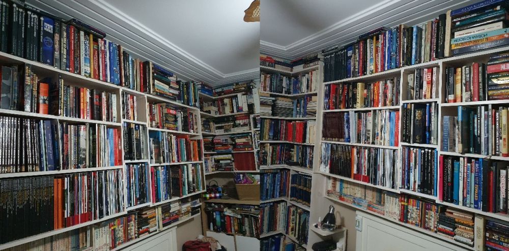 "Randomly" was wrong. The bookcases were made depending on the size and weight of the books and there is symmetry of sorts. But I guess it is like constructing Lego against a wall. And not just 295mm depth - there is 150mm and 250mm as well - all depends on the book sizes. It was a wraparound concept that started in one corner with a clockwise movement that negotiated a window, built-in cupboards and a door with some of it being floor to ceiling. No space was deemed too small.