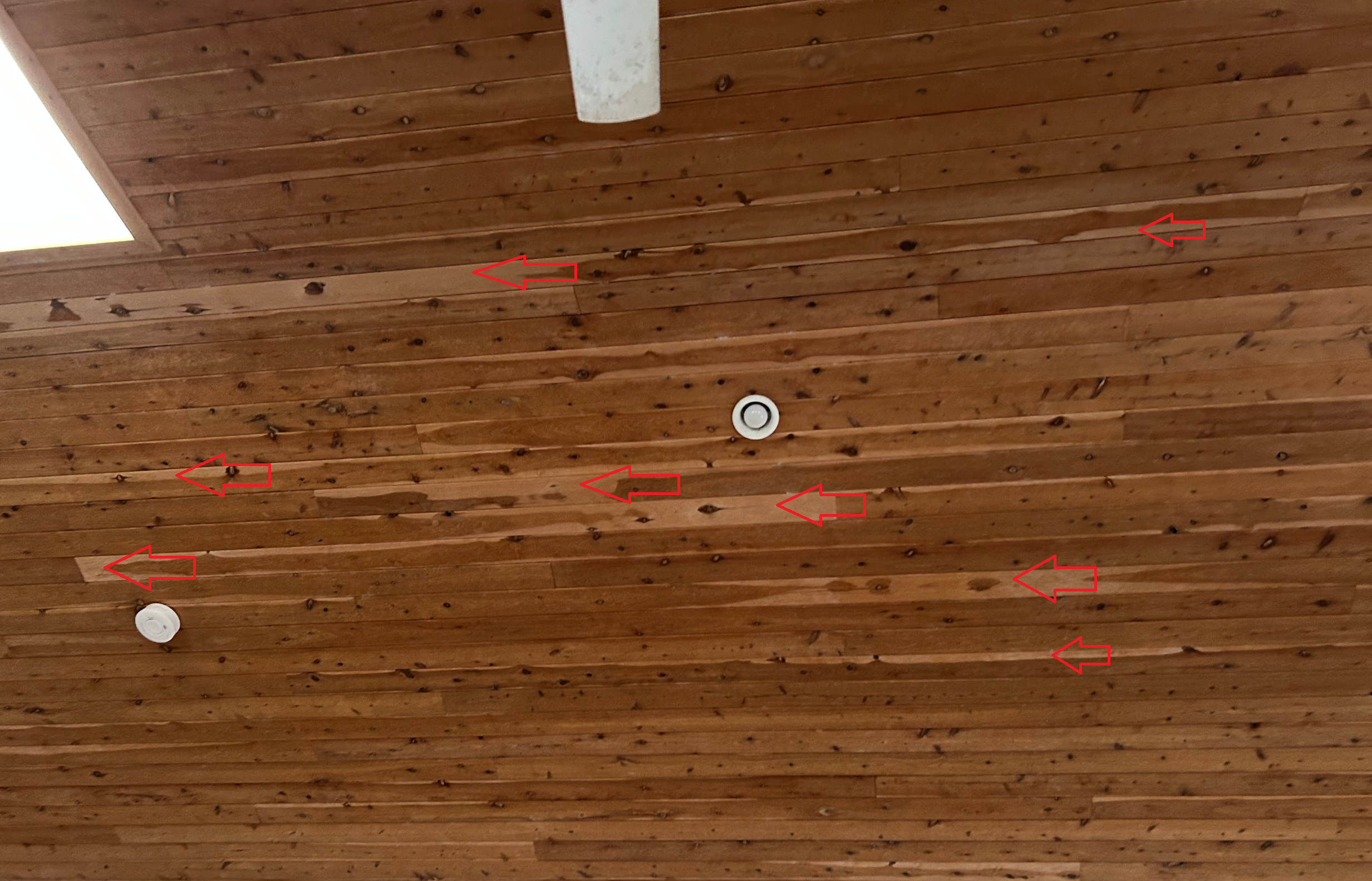 Thanks for your reply. The area of lightness on certain boards appears to be getting larger with time. I have taken a photo of a larger area of ceiling.