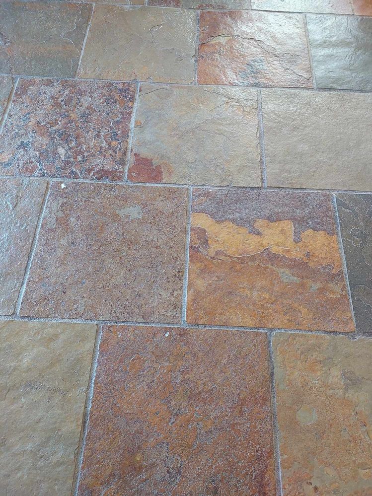 I would like to repaint our slate floor in a grey color, but I'm unsure about the steps to take. We've been living in the house for 12 years and have never sealed the floor. Some spots seem shiny, so maybe a sealer was used in the past. Do I need to strip the sealer, or can I sand it off? I would prefer not to use chemicals. Do I need a primer before painting? What type of paint should I use? I would like to keep the natural grout, so I believe I would need to paint each square separately and then apply the sealer all over. What sealer would you recommend? I prefer a satin finish over a glossy one. Thank you for any advise.