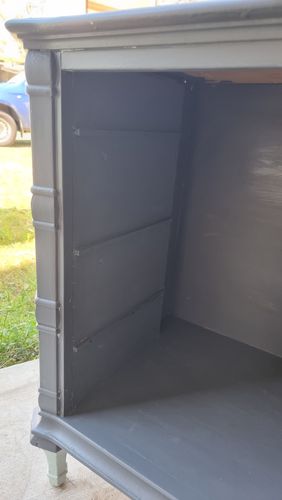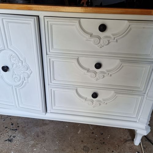 am wondering if should do something to the wood panel's corners. Would of loved to of done top planked to add thickness to the top. Brought some antique looking knobs by taskmaster and painted in dulux vivid white matt to go with other furniture have done. Just need to fix the door as isn't shutting and put a grab latch in behind it. My partner is happy it's nearly finished so he has more room in his shed lol