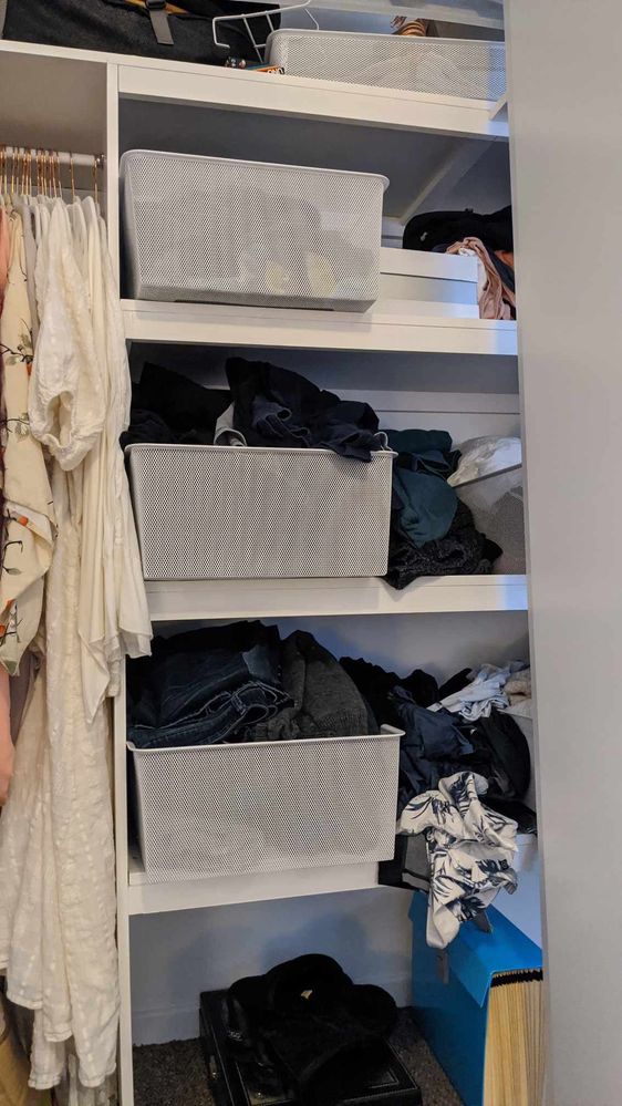 Thanks for sharing your question about your wardrobe. I suggest investigating your shelves carefully as you might be able to take it apart by removing the screws that are holding it together. I only suggest taking it apart carefully as you might be able to use the shelves in another location of your wardrobe.