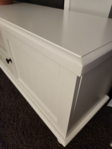 Thank you very much for the update, your TV unit looks great. I suggest putting a clear coat such as the Cabot's 1L Satin Clear Benchtop Timber Finish to seal the benchtop and to prevent it from getting attacked by moisture. The clear coat also serves first line of defence against everyday use.