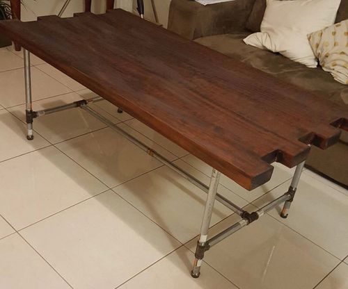 A friend gifted me a large piece of Jarrah he rescued from a skip. It had seen better days (unfortunately I didn’t take any before pics) but after a few days of sanding to get the very thick layer of varnish off it came up beautiful. I put a black stain on the then sanded it back down just so the grain had the stain in it then sealed it with wax. I used threaded galvanised pipe for the legs painted in Matt black and brass fittings polished. I turned it into a coffee table then after a while I got joiners and extended the legs and now it’s my office desk.