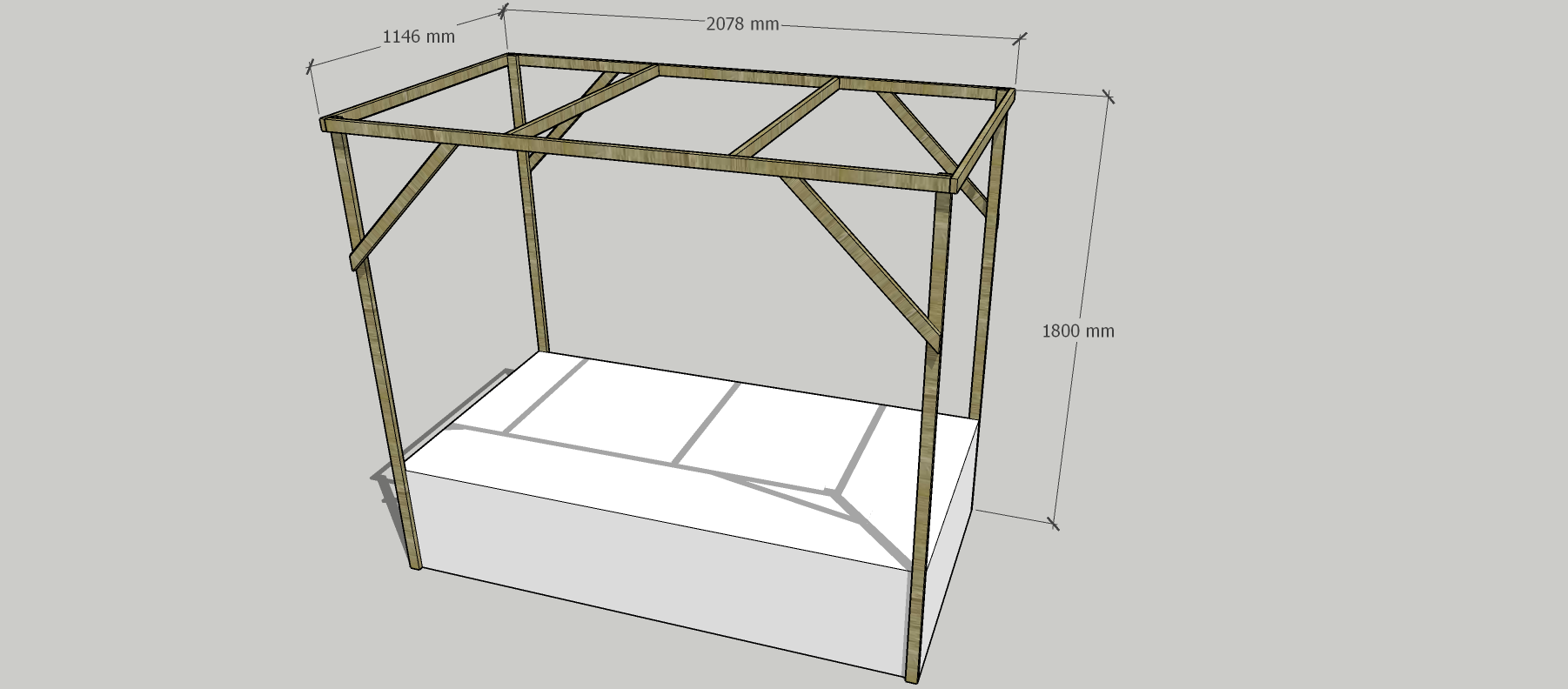 That's a fantastic project to be undertaking. I propose looking at using 42x19 timber moulding. It should be strong enough to hold light weight sheer curtains. It comes in several lengths so its best to measure how tall you want the four-poster frame to be. The timber frame can be joined together using standard 35mm timber screws. My best advice is to make sure to drill pilot holes to prevent splitting the ends of the timber pieces. The illustration is in plain timber but when painted white will blend in with the light colours of the room and the angled timber supports will not be so noticeable. Those supports are put in to prevent the long length of the timber from sagging.