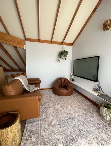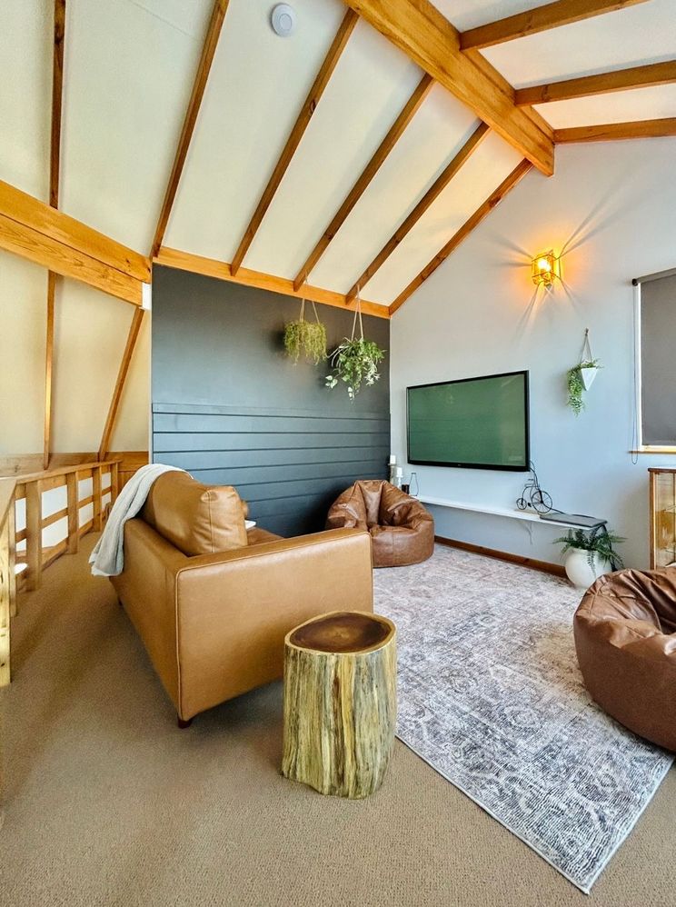 I recently turned an unused room upstairs into a second lounge/ retreat. I had a vision of making it feel warm and cozy, a place to just chill and relax. I was able to achieve this mood with selective furnishings and a dark feature wall.