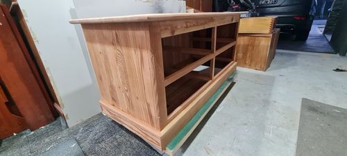 We had this low boy/mini boy which we flipped. We added legs to it, to give it a bit of height, and it compliment the look a bit more where you can use it really anywhere. The paint, stain and handles are all from bunnings.