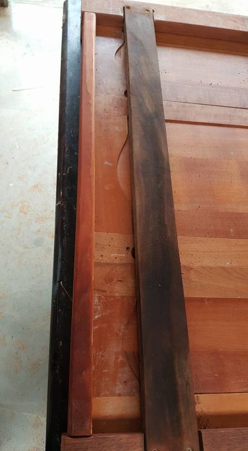 The size of the mattress is 107cm. So I cut a length of recycled pine 107cm for the top and 170cm for the bottom for the cupboard doors to sit in. I wanted the headboard to sit flush with the mattress and the posts outside the mattress on either side. I needed grooves in the top and bottom supports so I used the table saw again to make a groove as above. They were not matching in colour but that was part of the appeal for me. To put it all together I lay the 2 side post and the top an bottom post on a table and the cupboard doors were glued and slotted into the grooves.