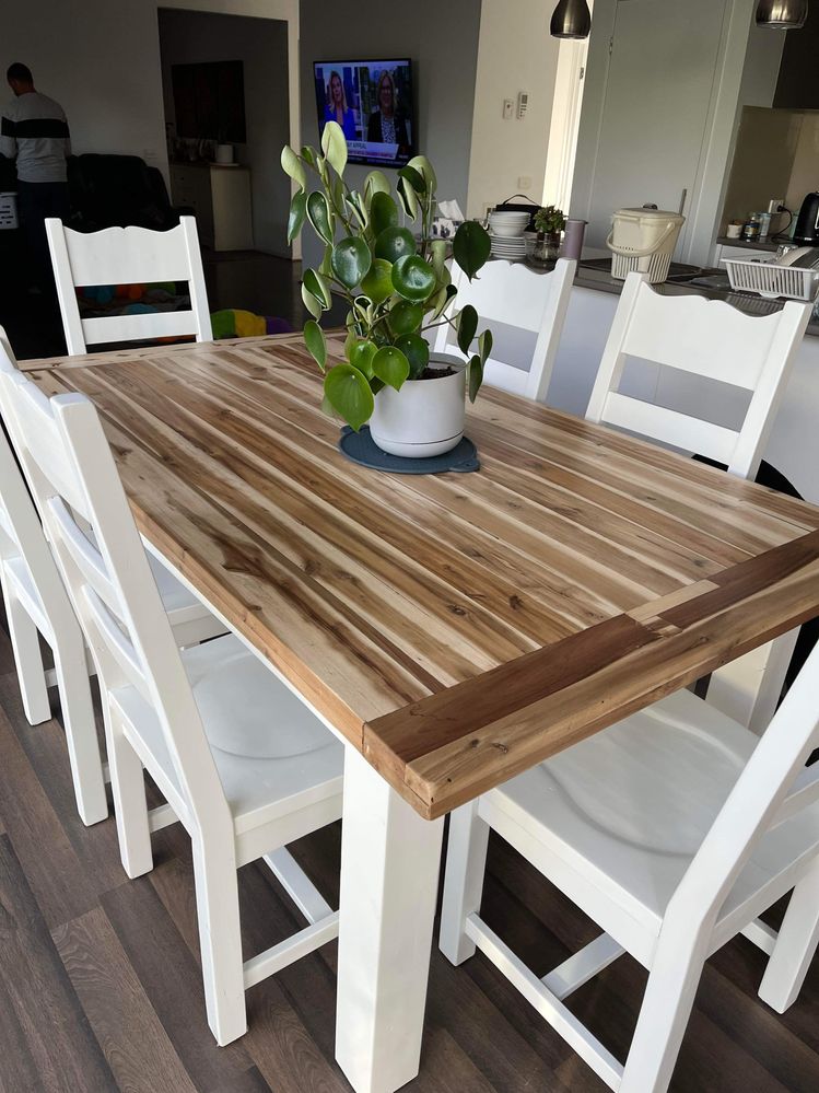 Each chair was slightly sanded to remove any peeling old varnish followed by tow coats of BIN zinzser and three coats of Milk cloud and lastly sealed with two coats of Timber Protect Clear Varnish.