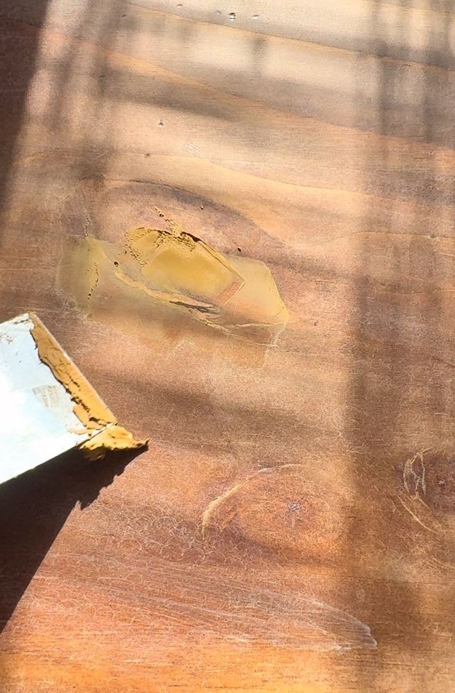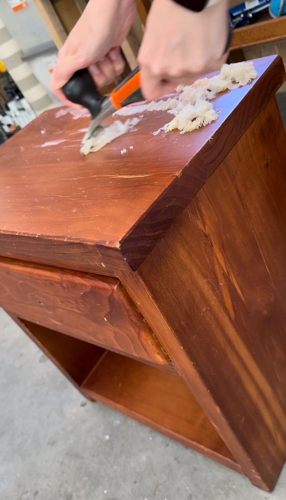 Prep the drawers for painting. To do this, use a carbide scraper to remove the clear coat and scuff sand using an orbital sander. All the finish needs to be removed from the top. Fill minor dents and imperfections with wood filler.