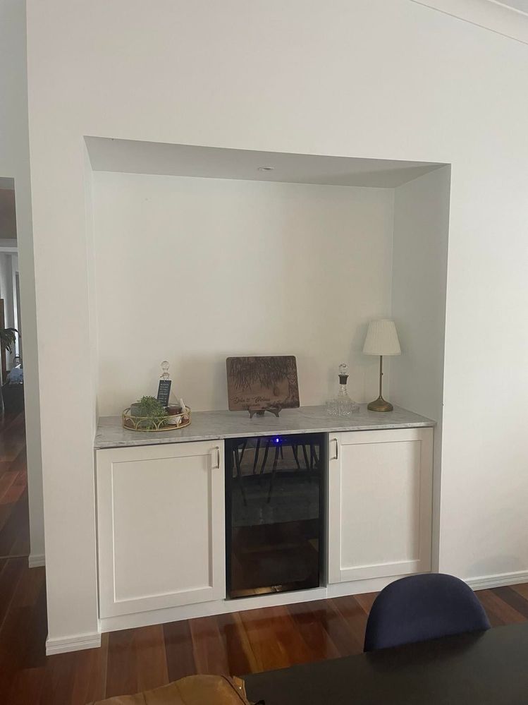 Hi Eric are you able to mock something up for me please? So one cupboard either side no arch with floating shelves in the middle of them and a wine rack underneath?  The cupboards would be 400mm wide so 200mm shorter than the base cabinets.  thanks so much