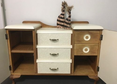 Give it a quick sand all over, with wood glue add the wallpaper to the drawers, Use ZINSSER BullsEye 123 UNDERCOAT PRIMER-SEALER STAIN BLocker 2 coats, paint with chalk paint and varnish with Cabot's satin vanish. Screw drawer handles on