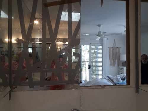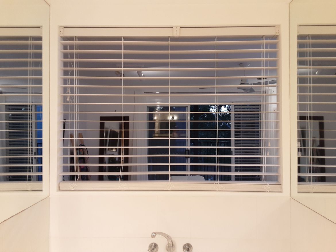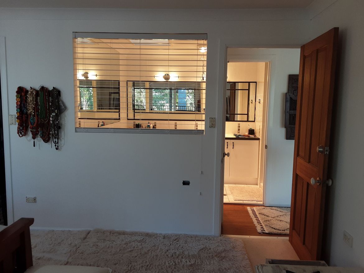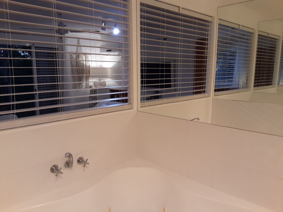 Knocked out wall above spa bath to create light and space from the bedroom ...currently have installed venetion blind..plantation shutters to come.