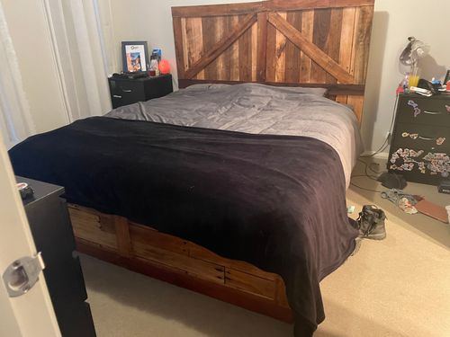 Our DIY king size bed. We started this DIY because the price of a solid wooden king size bed was out of our budget. We researched pallet beds and started from there. I absolutely love the barn door beds so we used that style for our bed. The base is made from pine pallets and the headboard and baseboard is made from hardwood pallets. All the pallets we acquired were free and we only spent money on screws and stain. I love that we were able to reuse some old wood pallets that were heading to the dump, now they have a new lease of life and will live on for hopefully the rest of our lives. This DIY took us a total of 10 days.