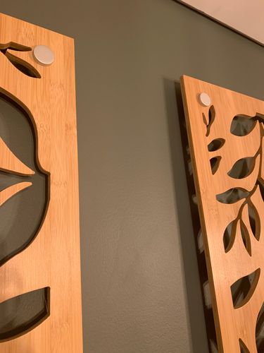 We live in an apartment and wanted to revamp our dining room. We used these outdoor bamboo panels from Bunnings, using aluminium stand off mounts in each corner to affix them to the wall. We fixed battery operated LED fairy lights to the back of the panels - not everything has to be used according to the label!