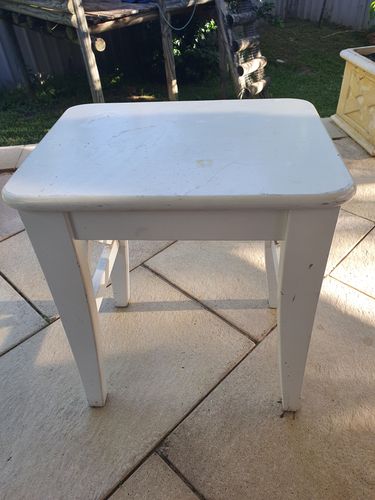 I found this small stool/utility table at vinnies for $10 and thought it would make a nice addition to our home. The frame was solid wood, but the top was MDF which had water damage.
