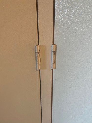 the wood is also split where the doors are hinged - I don’t think the previous owner drilled pilot holes before drilling the screws.