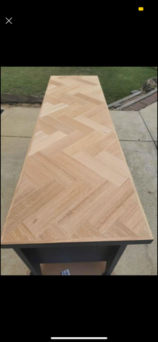 First thing that had to go was the glass inserts. Having a two year old boy at the time who loved bashing his toys on things and throwing things around, the glass wasn’t a safe option. My first idea was using rattan but I wasn’t sold on the look. Wasn’t what I had envisioned so I went with Tasmanian oak DAR cut to size and glued to 3mm plywood in a herringbone pattern then sealed and waxed and installed in the doors. The top was damaged and was just veneered MDF so I sanded and scratched up the surface so the glue I used could have a strong bond to the Tasmanian DAR cut to size and laid in a herringbone pattern and sealed and waxed