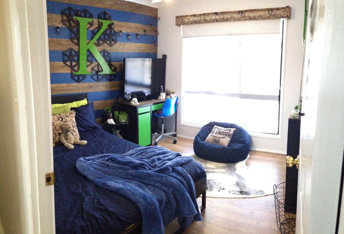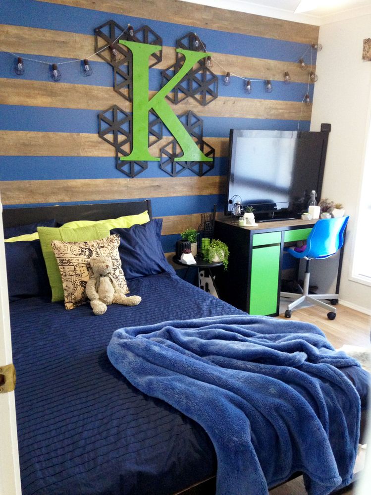 my sons bedroom makeover we used navy paint and vynil flooring self adhesive (this product was meant to be a quick application turned out to be a nightmare the glue wouldnt adhere to the wall and they kept peeling off, liquad mnails wouldnt adhere to the glue on the vinyl, the glue then melted down the walls on a super hot day eventually i used cladding nails and nailed them all in it just added to teh rustic look but had i known the effort of this walli would have just used real timber - which i did after this in other rooms with awesome reslts) the K was laser cut steel spray painted and the black metal is wall art from kmart, mix of kmart and ikea styling/furniture