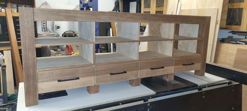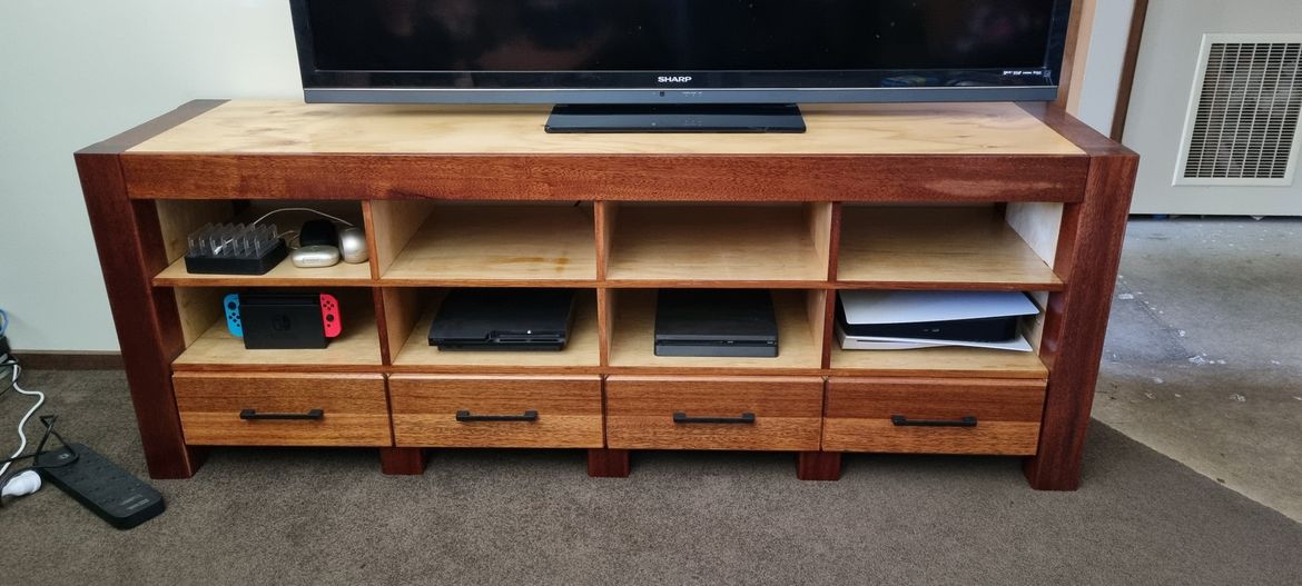 Here is our tv cabinet that I built. It is made from using merbau decking and 18mm ply. It 2000mm long, 500mm deep and 730mm high. I even made the legs by gluing a few pieces together, to make it solid. The top is 2 pieces of 18mm ply glued together. It's all been put together with some pocket hole screws. As an added feature, I ripped some decking down to some thin strip's and added them to the edge, just to hide the ply edge.