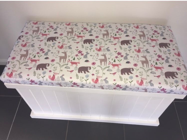 Remove old seat. Give toy box a quick sand, paint with chalk paint and varnish. Cut new piece of sponge cover with fresh new material and staple