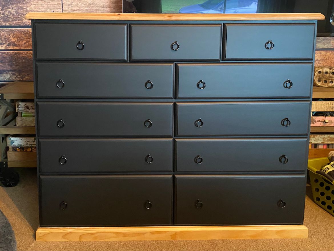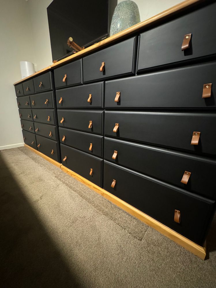 As we are renovating our home on a pretty strict budget, replacing our bedroom furniture was out of the question so instead, we have put some life back into it by stripping back the dark stain and using a clear matte polyurethane to the areas we kept raw and painting the rest in black (Trendy). Adding the leather handles has modernised these pieces nicely.