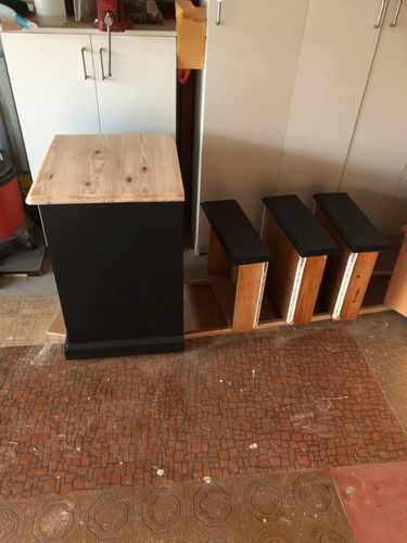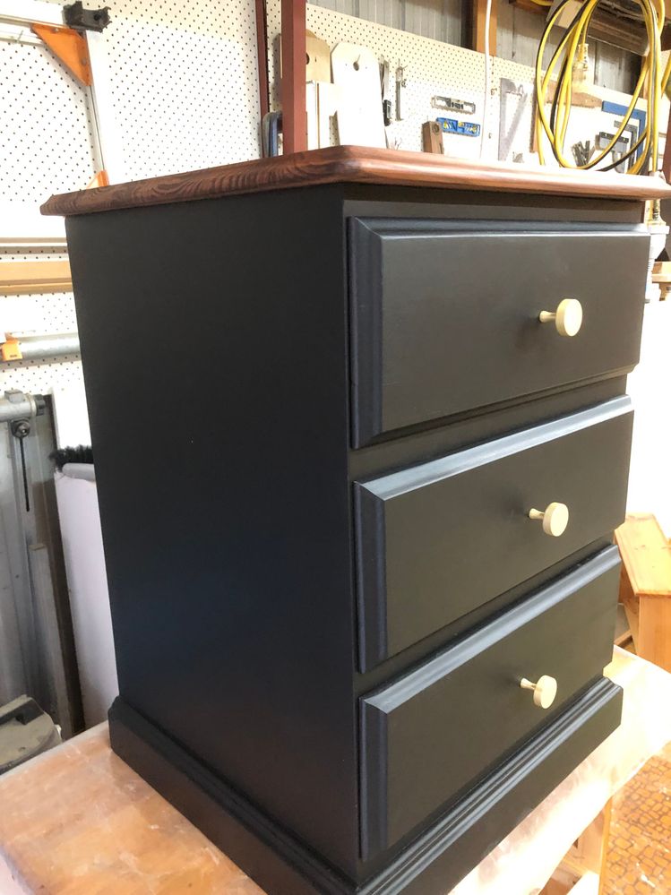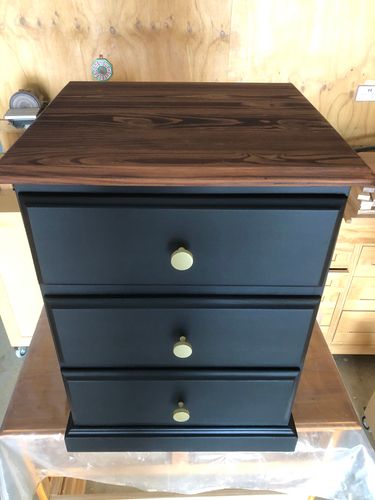 I sanded the top right back to bare wood., then stained 4 coats of Cabots water based cedar, then sealed to stain with a water based satin clear coat, the rest of the unit was sanded and painted in satin black using a 100mm x 4mm nap roller, (no brush marks, I also changed the drawer knob's to brass ones.