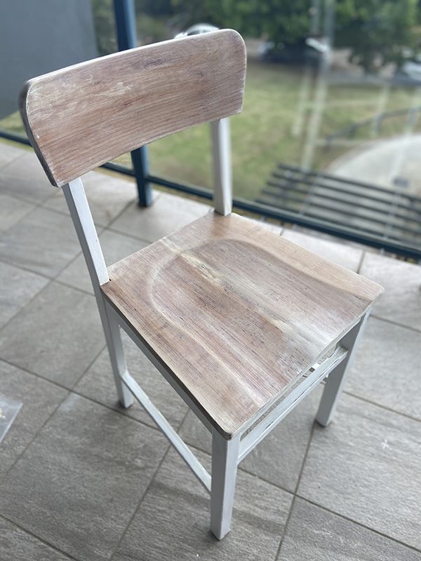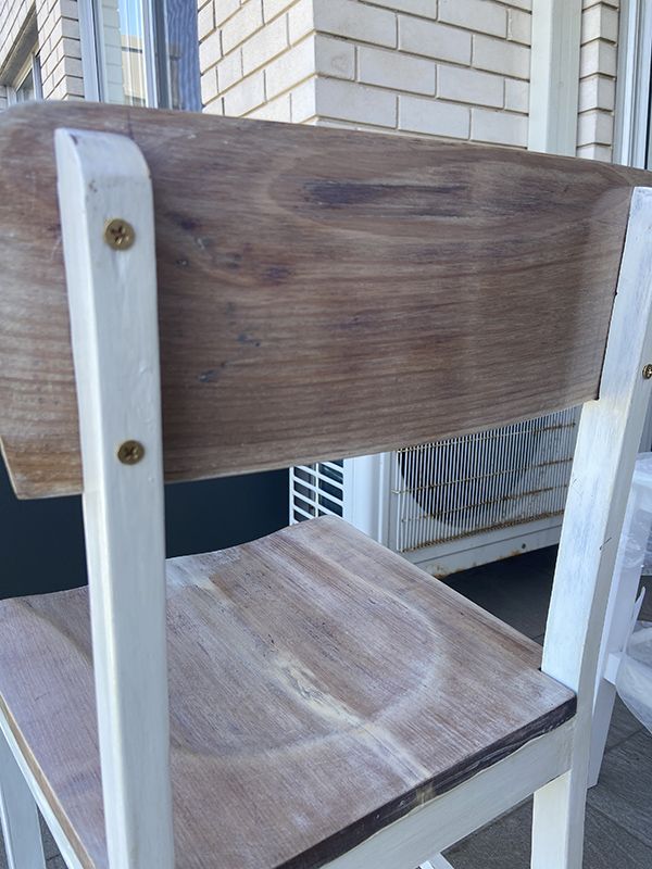 At the begining of sanding. Panels off the chair.Sand it by hand. 80 first then 120 then 220.At the begining of sanding. Panels off the chair.Sand it by hand. 80 first then 120 then 220.Wood filler for the holes and uneven surfaces and sand it againWood filler for the holes and uneven surfaces and sand it againPaint with Primer: British Paint 4in1 water based primer.Paint with Primer: British Paint 4in1 water based primer.Chalk paint and distress surface a bit. replace in gold screw. The panel of the chair I was using Feast Watson Satin. It left the orange-yellowish coat on it. My mistake was also applying on the white chalk paint plus my uneven paint skill. It leave the uneven dirty coatChalk paint and distress surface a bit. replace in gold screw. The panel of the chair I was using Feast Watson Satin. It left the orange-yellowish coat on it. My mistake was also applying on the white chalk paint plus my uneven paint skill. It leave the uneven dirty coatIt cracked after assemble back. I think next time I should use more wood instead of the screw back in. Gives too much pressure for the panel.It cracked after assemble back. I think next time I should use more wood instead of the screw back in. Gives too much pressure for the panel.I still happy what I did. and now i have another go.I still happy what I did. and now i have another go.