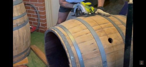 The first step was sanding the whole barrel to bring back the good oak, I used a belt sander and a 120 grit sand paper that o got at Bunnings. Then I secured cut the barrel in a half using a circular saw.