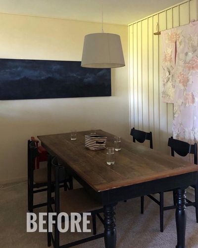 Our dining room had no windows, and has always been a bland, uninspiring space. I decided to work with its limitations and painted a cloud fresco wall and the other wall a dark charcoal. New light shade from Bunnings and it’s a moody, interesting space now.