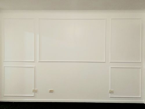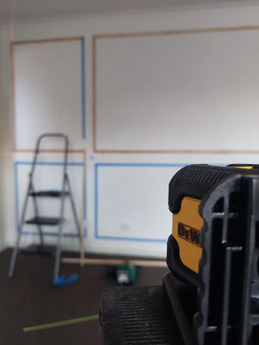 We first designed and marked out the proportions of the rectangles to allow for balance and composition with the door height, windows (opposite wall) and general room layout. We used a laser level and tape to ensure accuracy. Took a few tries to get it right, but we nailed to balanced proportions!