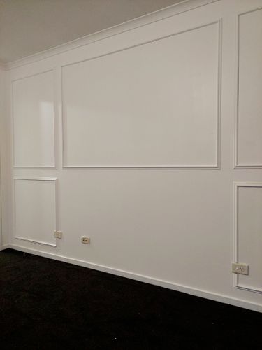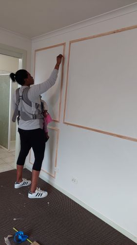 We then filled out nail holes and the mitre corners with wood filler to allow for a neat and tidy finish. After it dried and a bit of sanding, we then filled the gaps between the trim and plasterboard with gap filler.