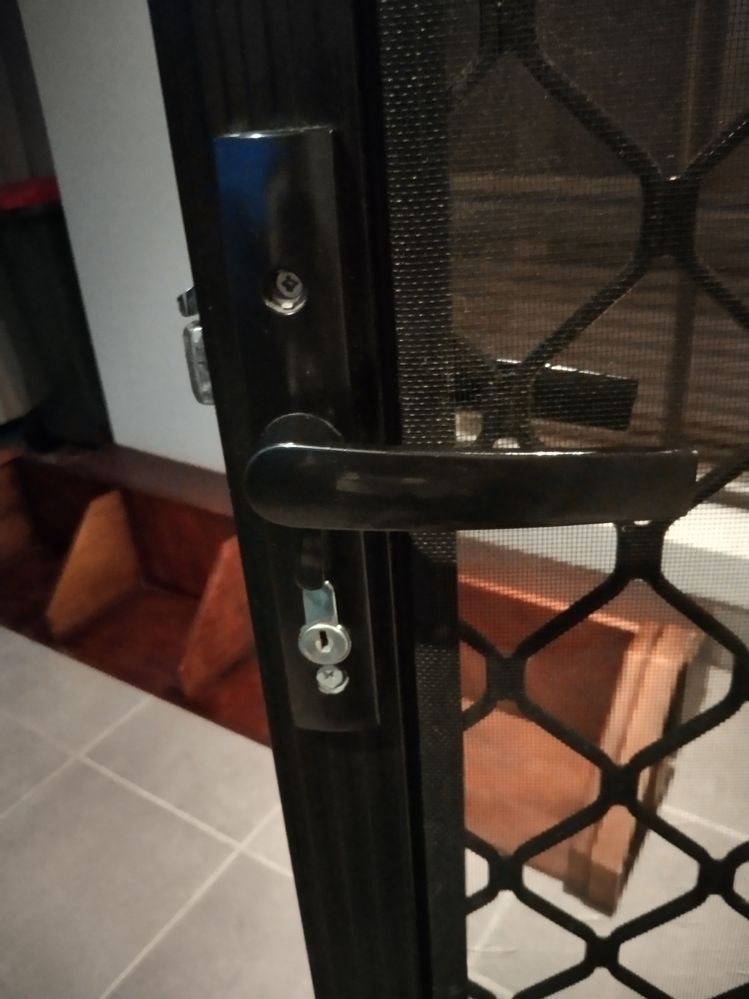 I suggest you take your current lock, door insert, and handle set into the store to match the mounting hole locations with a new lock. You should find that the Rolltrak Black Keyed Hinged Screen Door Lock is a close match, but we'll just need to double-check that for you.