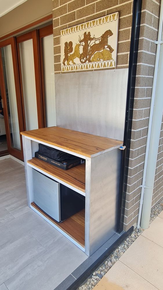 Cut all my timber to size. Started to glue and screw up all the frame work. Cut the 16mm hardwood for the bench top. Originally planned to have doors but we changed our minds and kept it open. Once all was screwed together, measured up what was required to cut the aluminium side panels and splash back.
