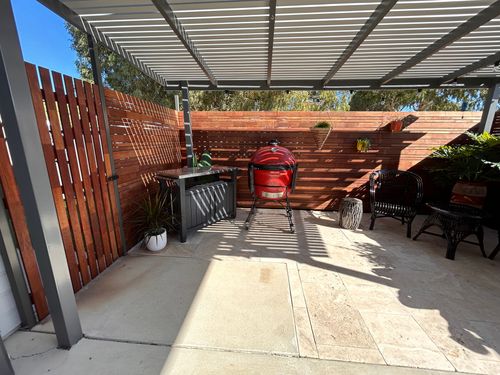 Recent build in lifestyle village. Large carport, small backyard. Open area with no defined spaces, colour variation or privacy. Plain colourbond fences, no shade and little protection from wind and sun. No sitting area. Pretty stark and drab but what a difference a handy hubby and bunnings can do. Very happy with the result.