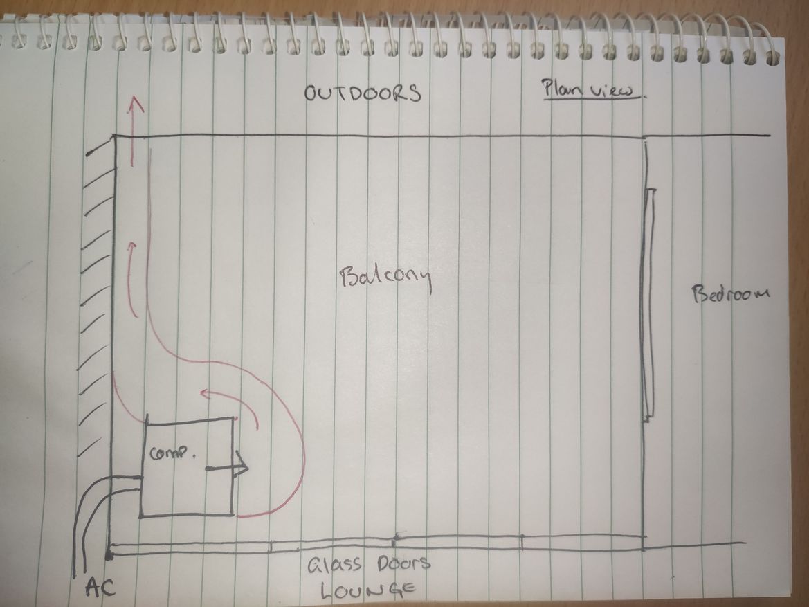 I have recently moved in to an apartment whose large AC compressor sits on the outdoor balcony. With eth AC running indoors the balcony is unbearable due to the significant hot air being pumped directly into the space.