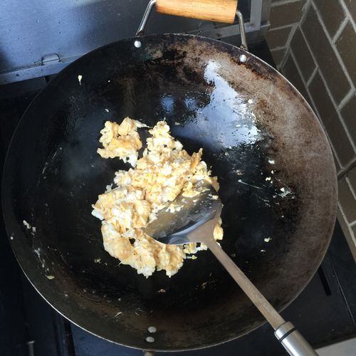 1. Put 2 tablespoons of oil in wok. Add egg and chop into fine pieces. Store in bowl and cover. Wipe wok.