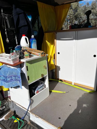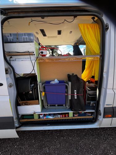 my “ seat “ when raining , toiletries cupboard over battery box also . I have tried to keep floor space at max as I use this van also for my farm shopping , it’s my only vehicle .